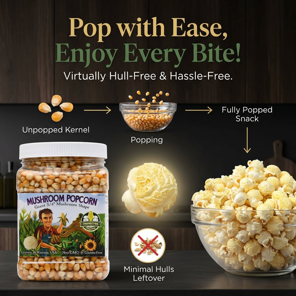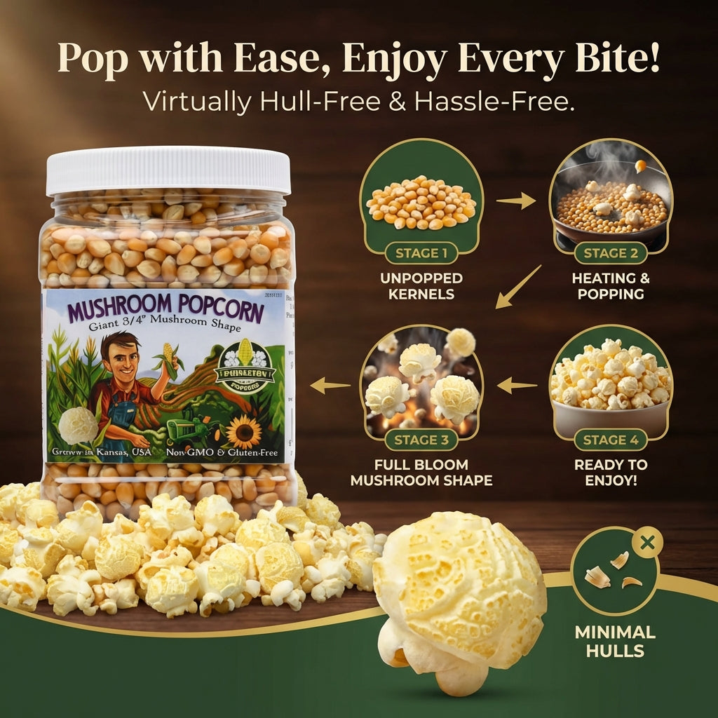 Realmente nunca verás palomitas de maíz como estas en tu vida. Cuando se revientan con una máquina de aire comprimido, aceite caliente o una estufa, los granos se convierten en una gran bola de palomitas de maíz con forma de hongo. Nuestros clientes han dicho que son las palomitas de maíz más grandes que jamás hayan visto, ¡lo que les recuerda sus nostálgicos días de feria estatal! No recomendado para hacer estallar en microondas. Los granos explotarán pero no mantendrán una forma de hongo consistente ni alcanzarán su tamaño completo.