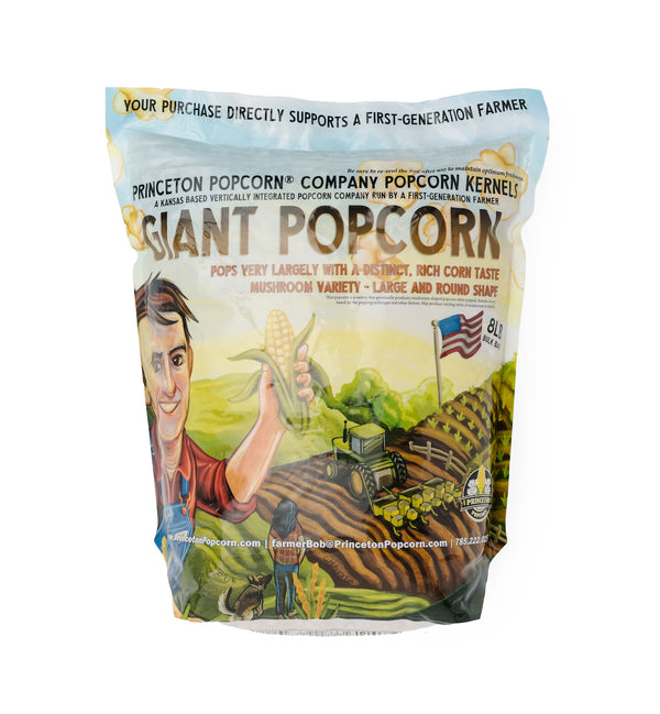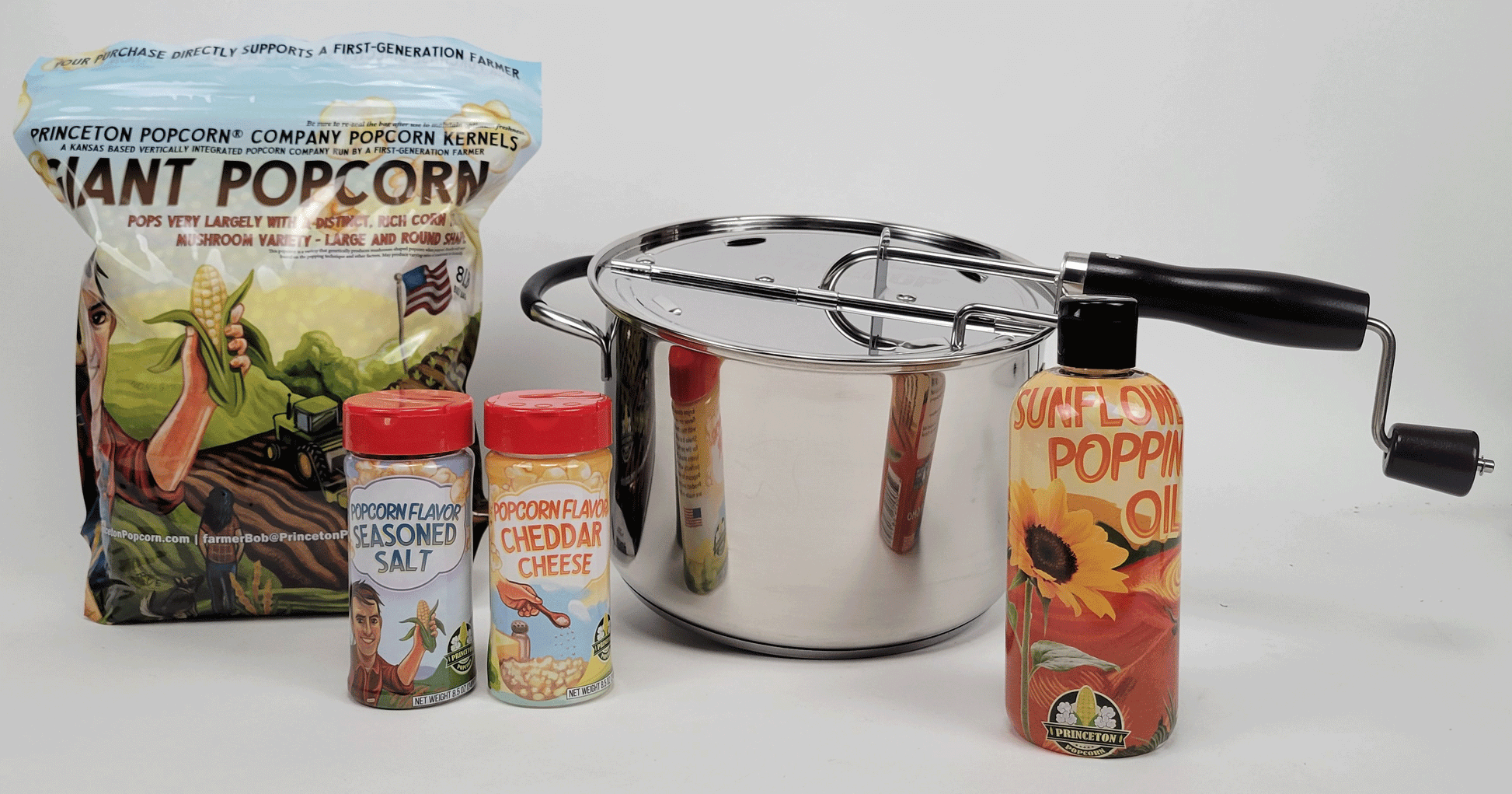 Este paquete incluye el palomitero favorito de Farmer Bob, así como una bolsa gigante de 8 libras de las famosas palomitas de maíz con champiñones de Princeton Popcorn.