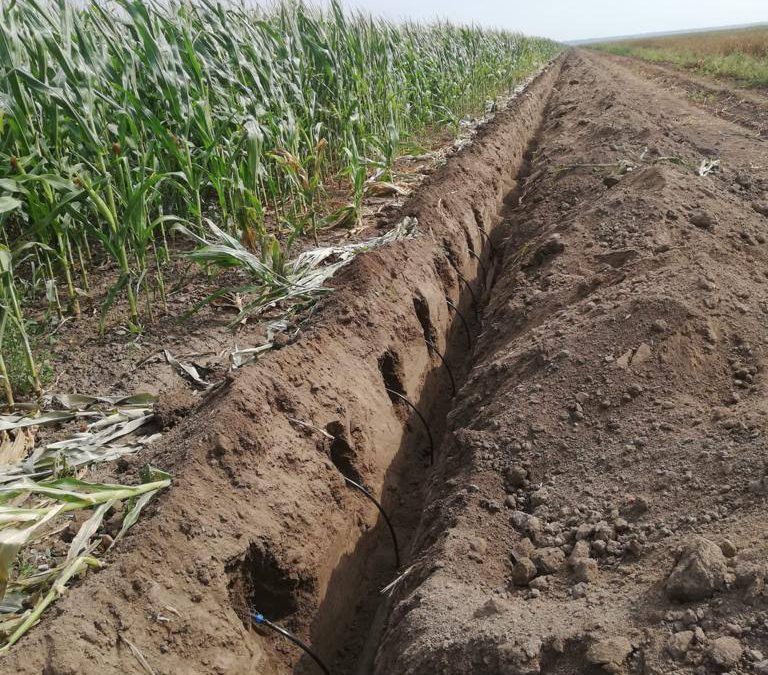 The drip tape is installed 12”-16” below the ground so the corn plant’s roots are no farther than 5” from water.