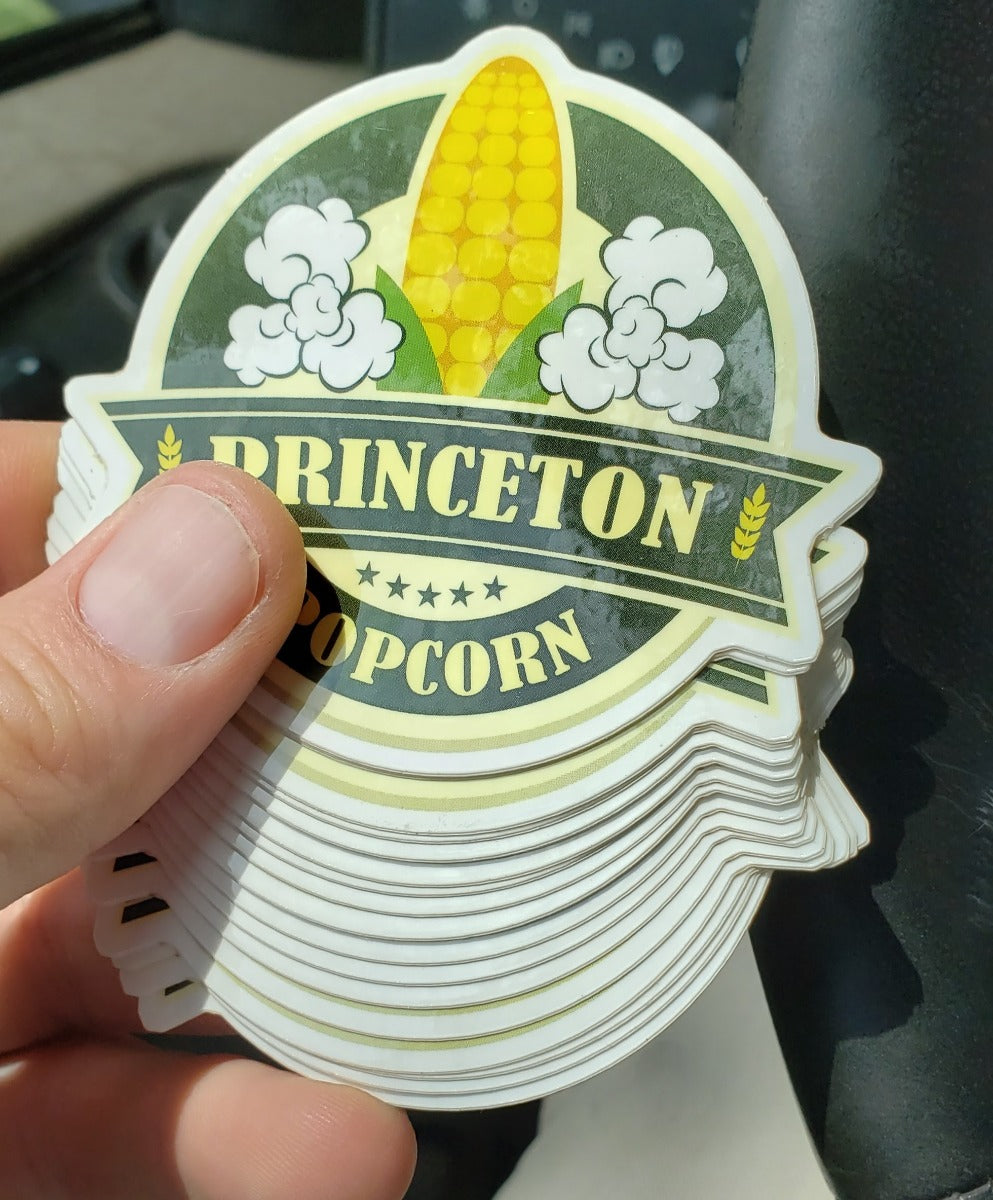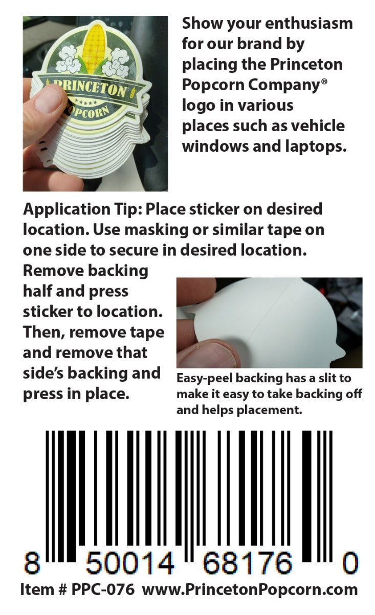 Mesurant 3" d'une pointe de ruban à l'autre et mesurant environ 2,5" de haut, cet autocollant en vinyle de haute qualité est parfait pour montrer l'enthousiasme de votre marque Princeton Popcorn.