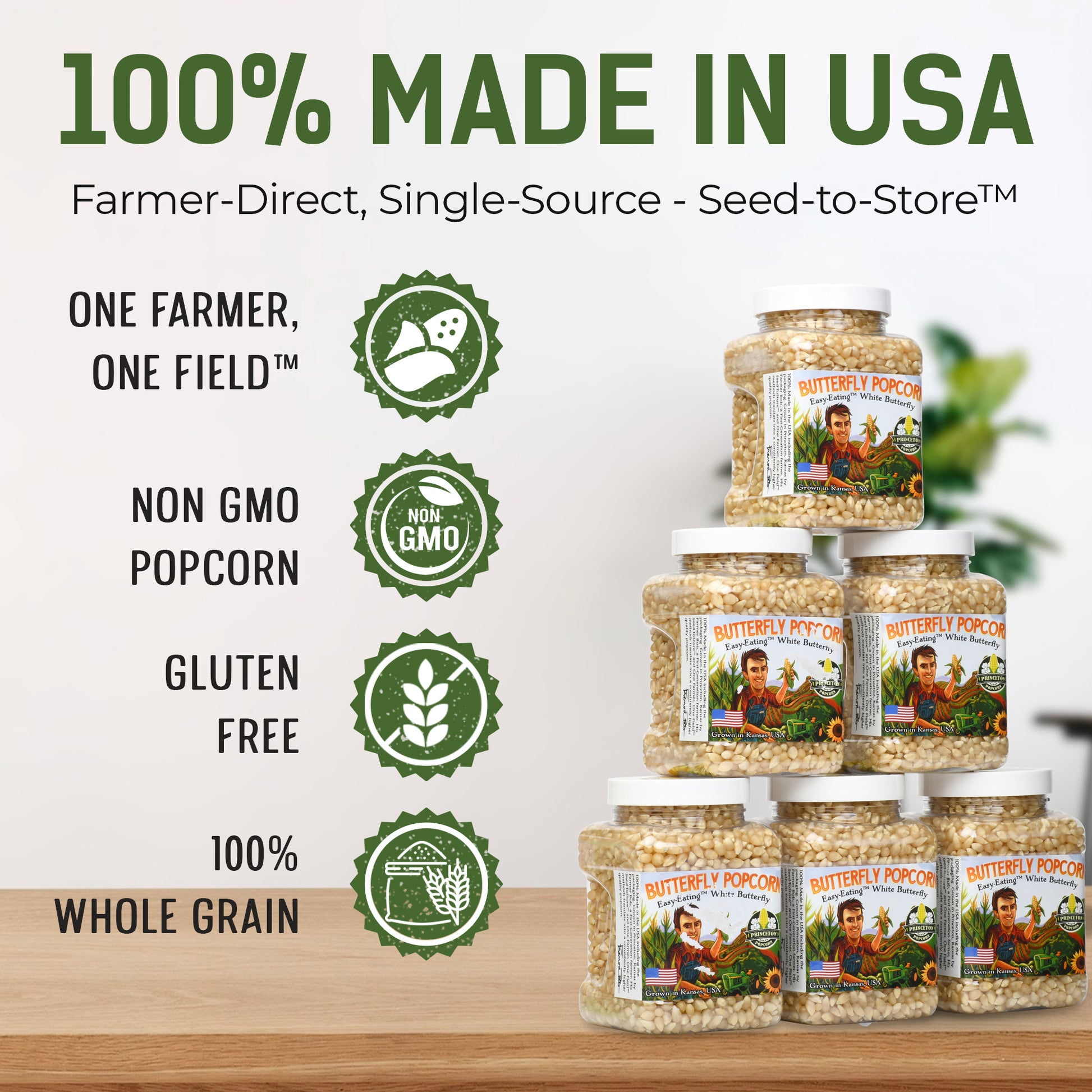 As a First Generation Farmer, Farmer Bob has cultivated high-quality popcorn grown on his farm in Princeton, Kansas. Our easy-eating white butterfly popcorn kernels are responsibly grown with the utmost care using Non-GMO seed. The brand’s philosophy is one of clean labels, short supply lines, and a personal connection to the product.